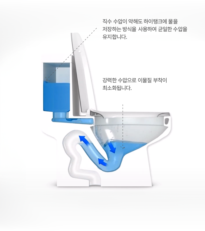 S자 모양의 트랩을 통해 사이펀 현상을 이용하는 세정 방식으로 이물질을 트랩에서 걸러주기 때문에 배관이 막힐 확률이 적습니다.